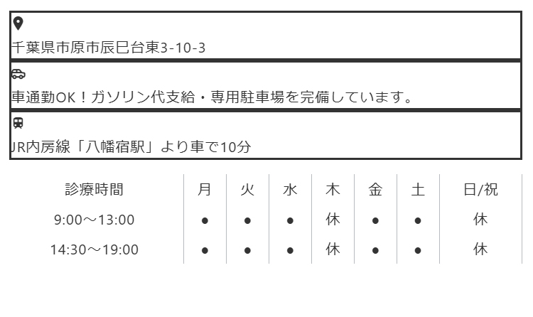 R内房線「八幡宿駅」より車で10分 車通勤OK!ガソリン代支給・専用駐車場を完備しています。 |